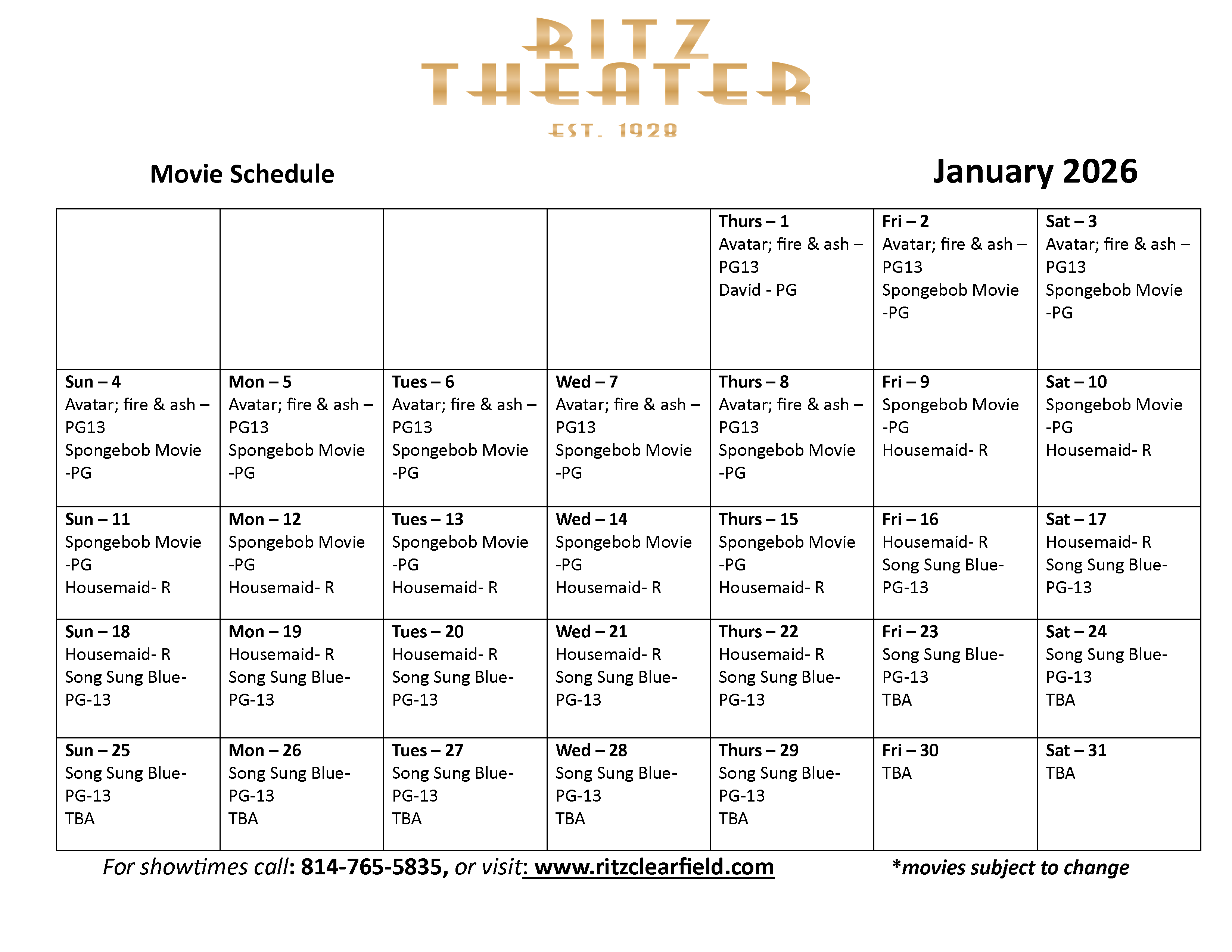 January Movie Calendar